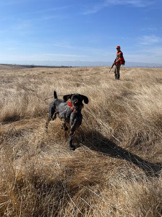 He is looking for his forever home as he has not been great around kids as he has some resource guarding. He would do best with a single handler that can be consistent with him. He has a ton of go and not a lot of stop. We've been hunting him and he loves it. Currently working on his stopping/pointing. He has a pretty natural retrieve and a BIG desire for birds (and squirrels and cats). He does have resource guarding issues but easily found some harmony with my other dog after some exposure work. He does still guard with other dogs he doesn't know. He is really eager to please and all he wants to do is exactly whatever makes you happy but he can get a little too excited can be very mouthy. The mouthiness is something my husband does not discourage but I don't allow and he knows not to do it with me so I think with better and consistent training he could leave it behind. He'd be so happy as a solo dog with someone active who could take him out in big spaces every day. He loves hunting but more than that he just loves being out with his people. Currently he runs at a vineyard several times per week and gets out at least once per day for an off leash run. He has a fantastic off switch at home but thrives on being exercised. If he's not able to get out he gets over excited in the house. I do run him at a large, open off leash dog park but closely manage all dog interactions and do not let him linger, he can greet and move on from any interaction as long as it doesn't last too long. He is crate trained at home and travels well in a crate for both short and multiday trips. He's a fantastic dog.