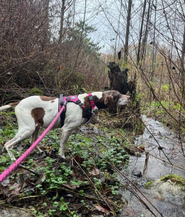 She appreciates short, easy walks focused on sniffing and decompressing. Ginger is good on leash in areas where the environment is calm and quiet. She is excellent in the car and calm for vet visits.