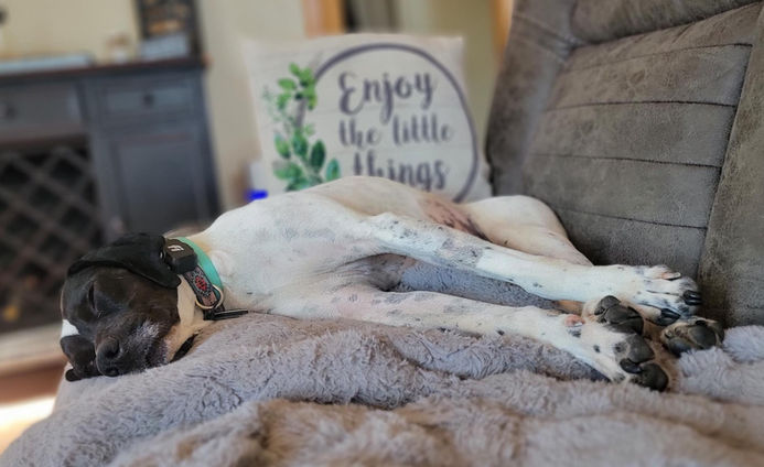In terms of obedience, Rhen has already mastered commands such as "place", "sit," "down," "wait" and "kennel," showcasing her intelligence and willingness to engage in training. She is both house trained and kennel trained, making her a well-behaved companion. She is learning fetch and will retrieve a toy thrown out the slider and bring it right int onto place. Rhen has developed a fondness for lounging in the sun, soaking up the warm rays that filter through the windows of the house, and she adores snuggling on the sofa with her human friends. Toys and bones have become a source of joy for her now that she understands their purpose and enjoys playing with them.